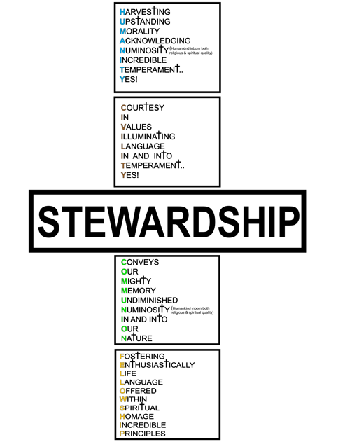 Stewardship encompasses the qualities, attributes and characteristics of human behavior and conduct that rises to an appreciable level that renders confirmation, revelation and truth regarding both the consecration and sanctification of humankind both spiritual nature and spirituality. And, both the ordainment and anointment of the engendered values, morals and ethics that both predistine and predispose us to both the standards and structure of both the letter of God’s humanity and civility and both communion and fellowship. Therefore, Stewardship distinguishes both the multi-numerous and varied both ideas and ideals of both the ways and manners of human behavior and conduct in both domestic and business life.